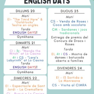 Us adjuntem el cartell amb les activitats previstes per a la Setmana Cultural i els English Days. Així mateix, també us fem arribar el cartell de la mostra de danses i batucada que hem preparat...
