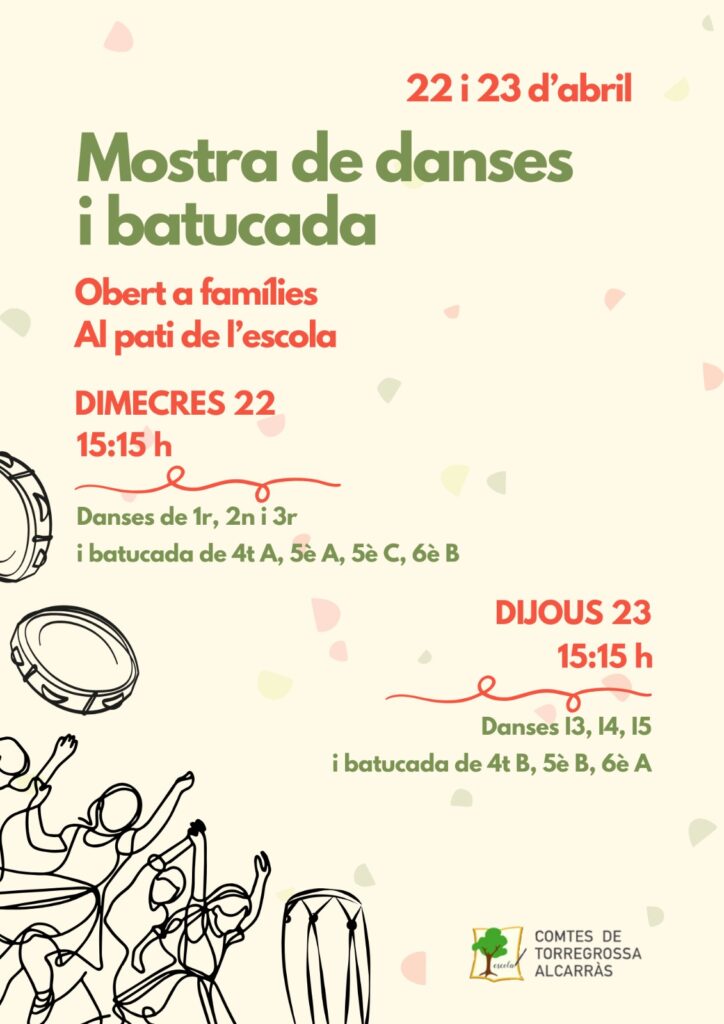 Així mateix, també us fem arribar el cartell de la mostra de danses i batucada que hem preparat per a aquesta setmana, oberta a totes les famílies.