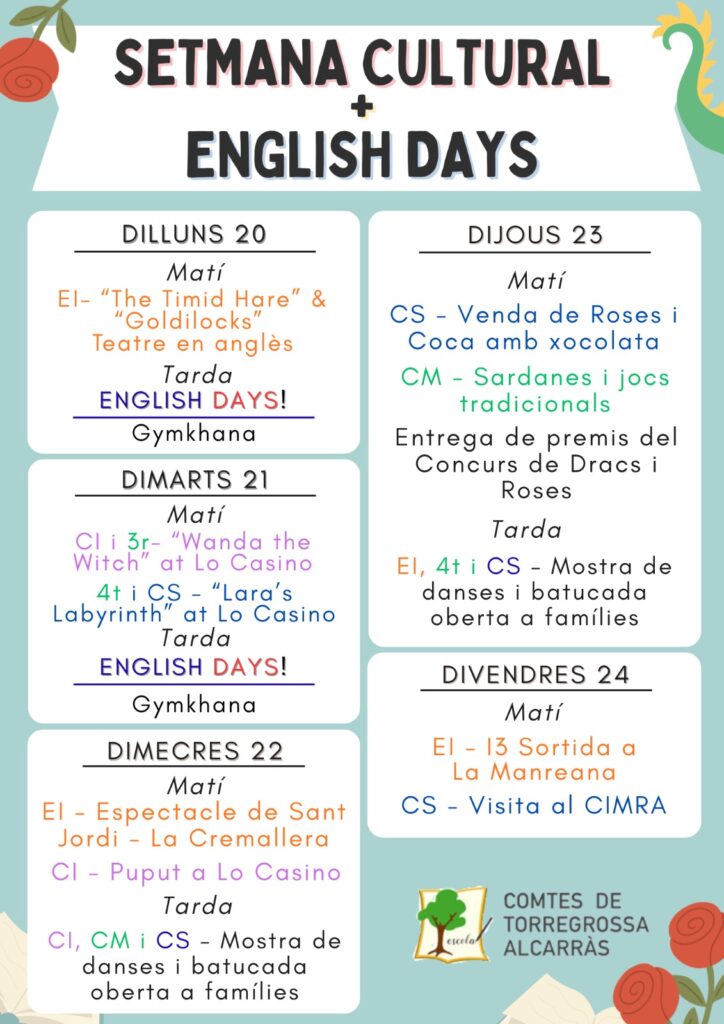 Us adjuntem el cartell amb les activitats previstes per a la Setmana Cultural i els English Days.